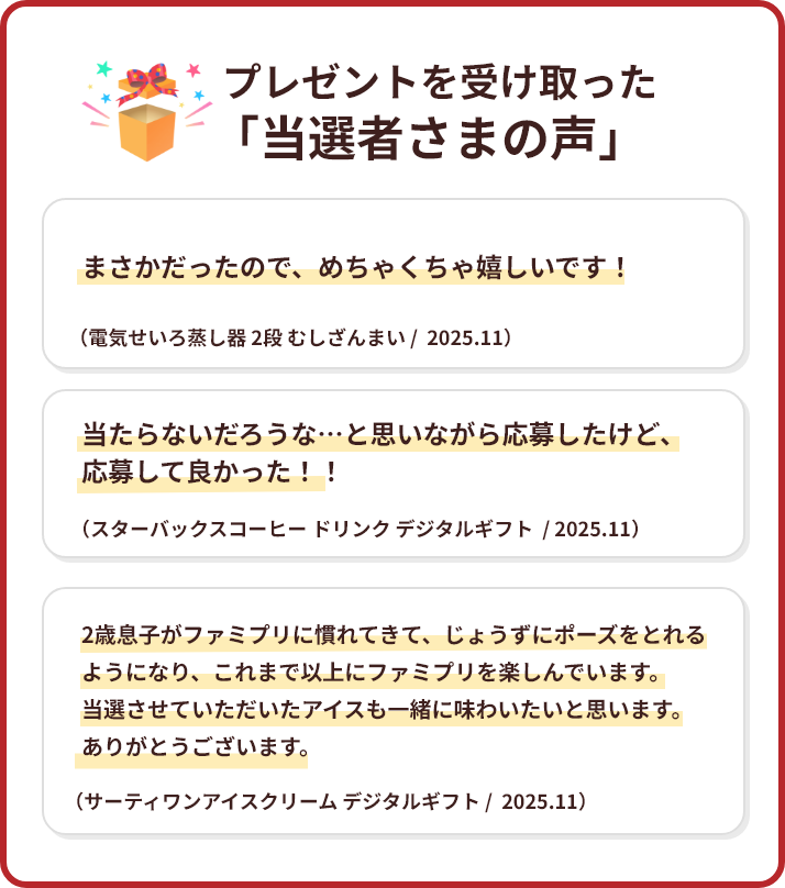 当選の通知は当選者のみに、応募いただいた際にご利用のファミプリアカウントメールアドレス宛に行います。